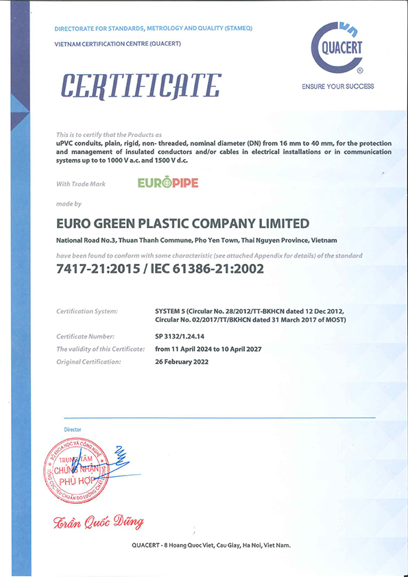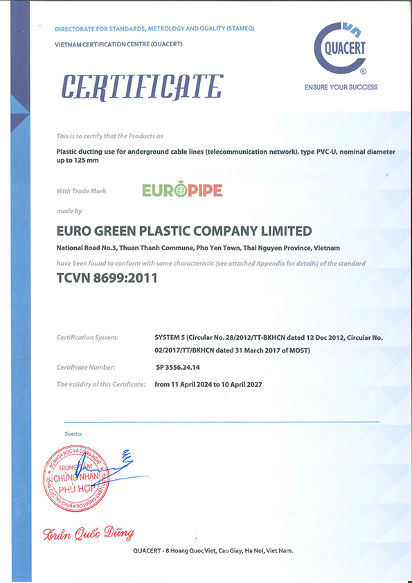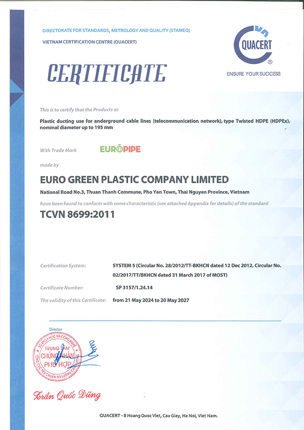 CERTIFICATE OF CABLE CONDUIT PRODUCTS