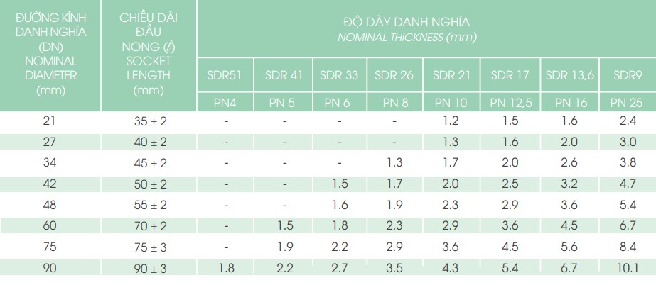 uPVC Solvent Cement Joint Pipe 1. ÁP SUẤT DANH NGHĨA PN DỰA TRÊN HỆ SỐ THIẾT KẾ C = 2,5 2. ÁP SUẤT DANH NGHĨA PN DỰA TRÊN HỆ SỐ THIẾT KẾ C = 2,0 Chia sẻ