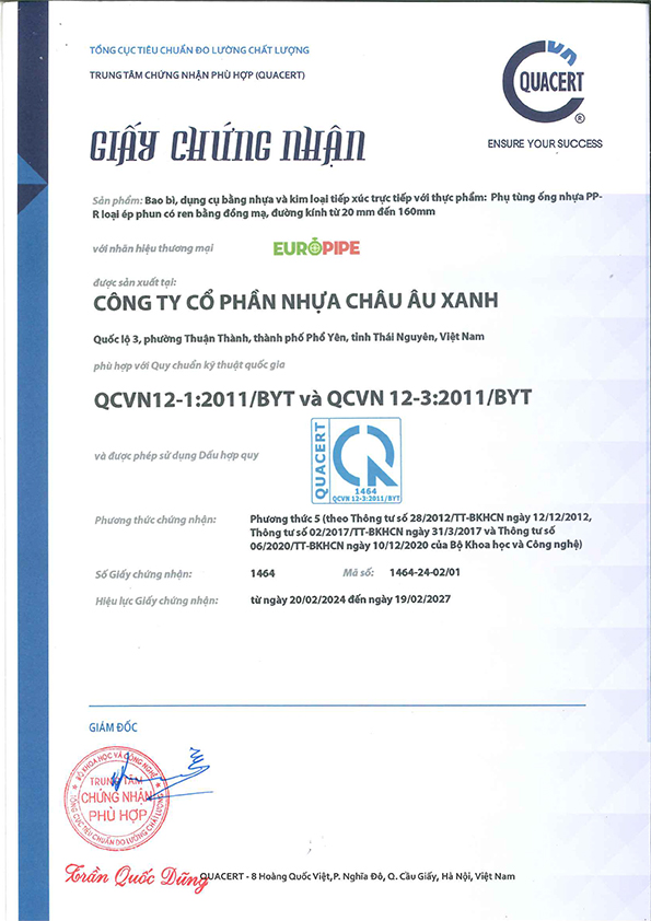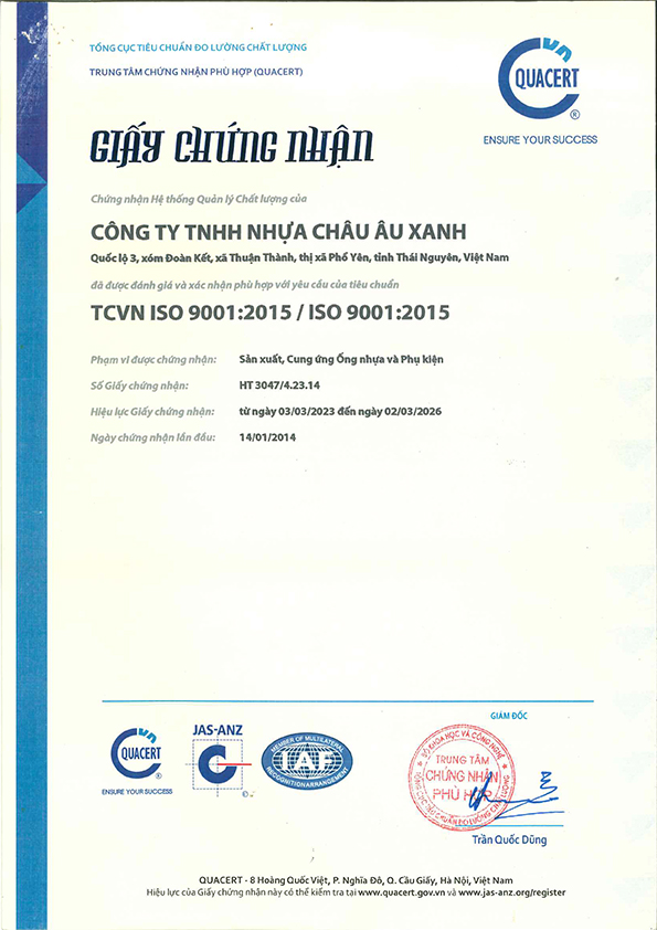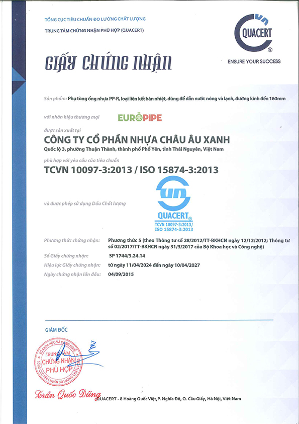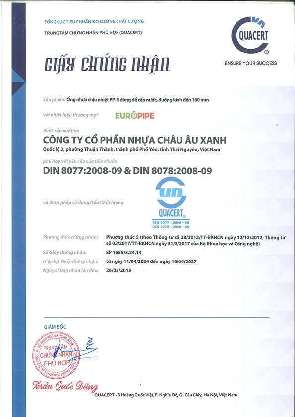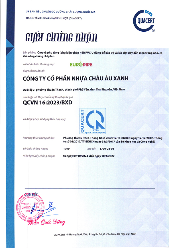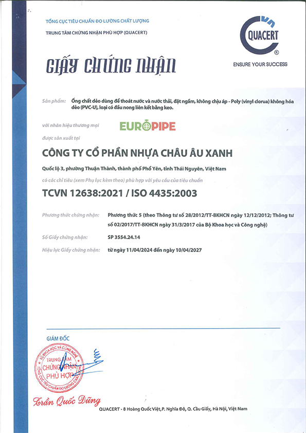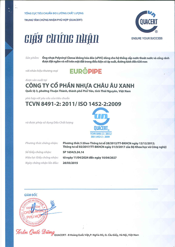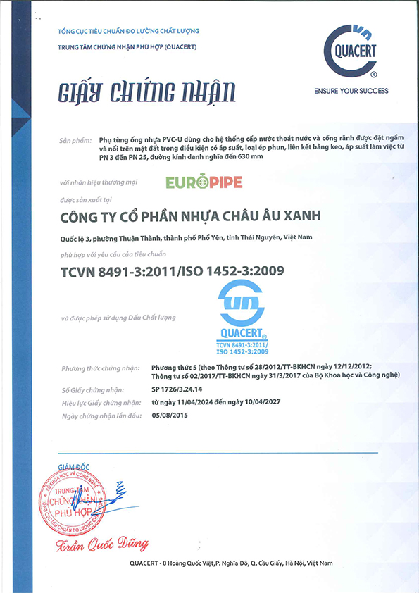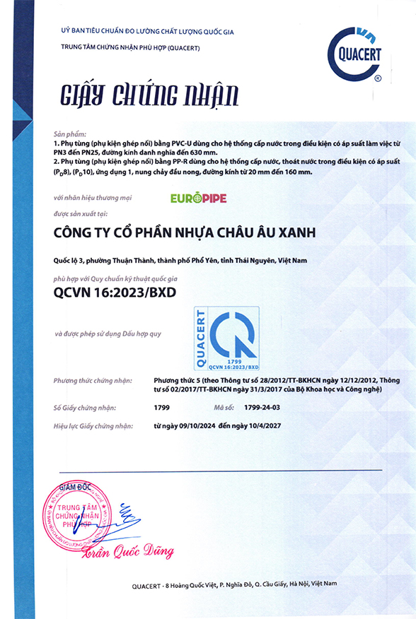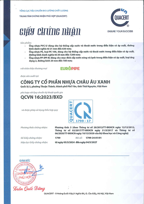 CHỨNG NHẬN HỢP CHUẨN SẢN PHẨM uPVC