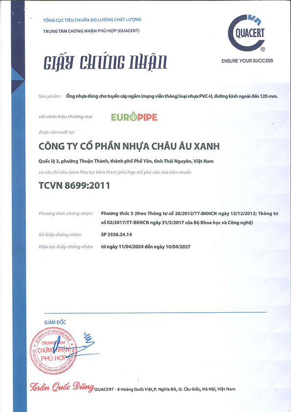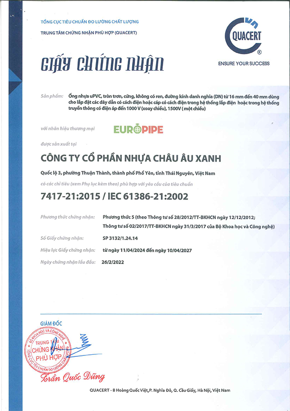 CHỨNG NHẬN HỢP CHUẨN SẢN PHẨM ỐNG LUỒN CÁP