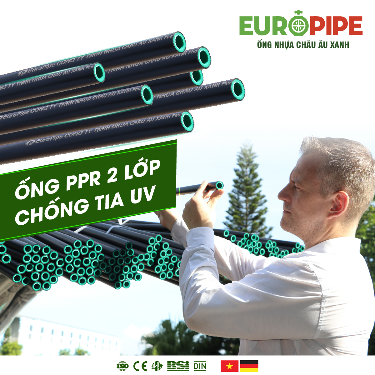 Europipe tự hào là một trong những nhà sản xuất ống nhựa hàng đầu Việt Nam, cung cấp các sản phẩm đạt tiêu chuẩn chất lượng Châu Âu. Với sự đầu tư vào công nghệ sản xuất tiên tiến, Europipe đảm bảo sản phẩm ống nhựa PPR 2 lớp chống tia UV không chỉ đáp ứng các yêu cầu khắt khe về kỹ thuật mà còn bền vững với thời gian.